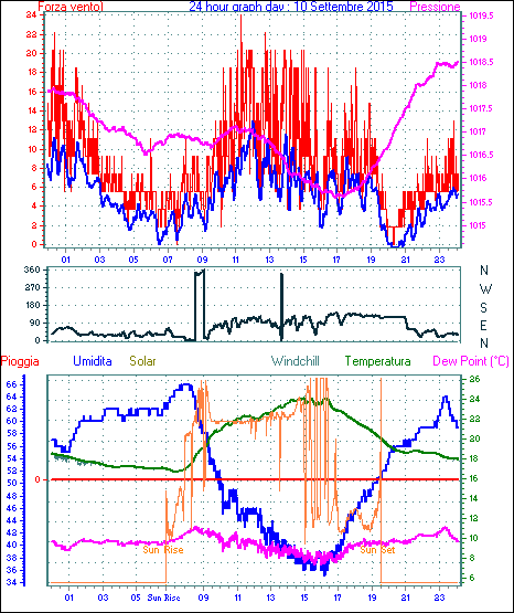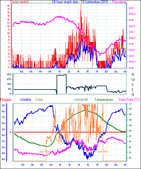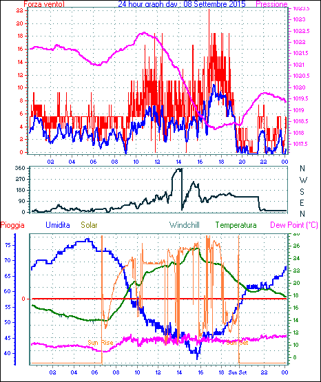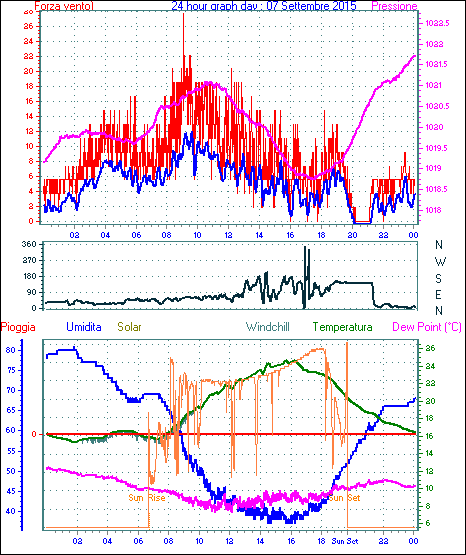 Velocità massima di raffica = 18.5 km/h da 248°(WSW) giorno 01 tempo 16:59