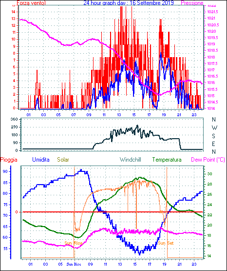 Velocità massima di raffica = 14.8 km/h da 225°( SW) giorno 01 tempo 16:48