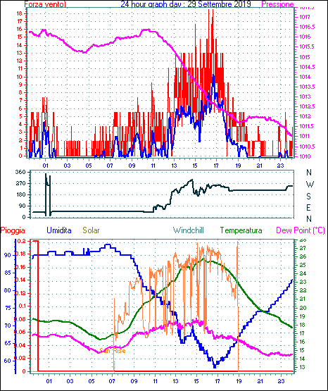 Velocità massima di raffica = 18.5 km/h da 248°(WSW) giorno 29 tempo 16:36