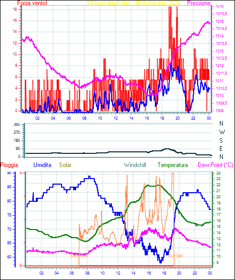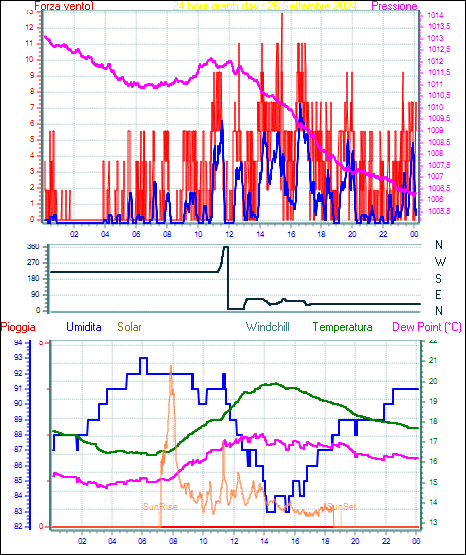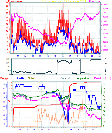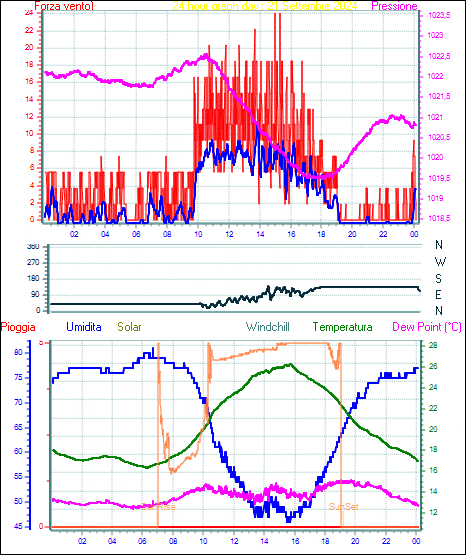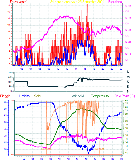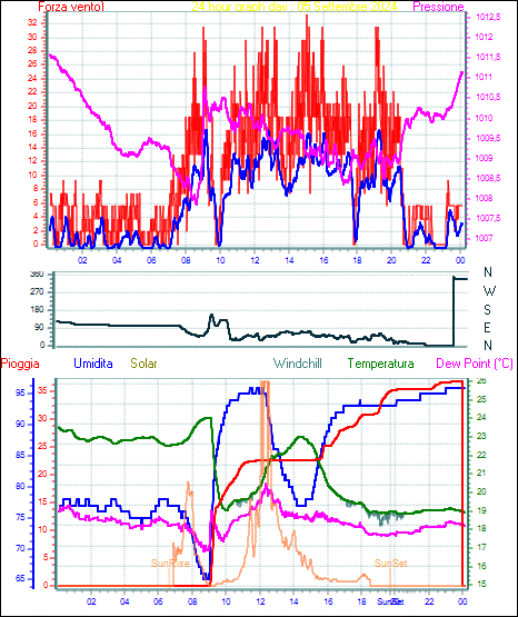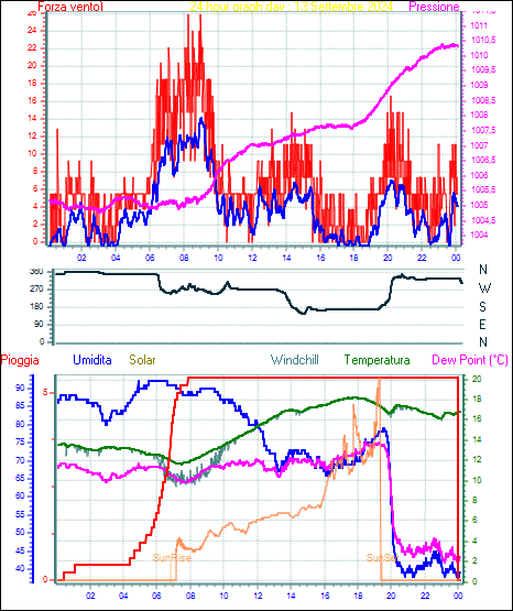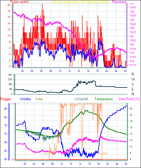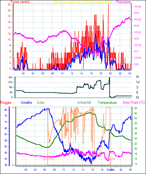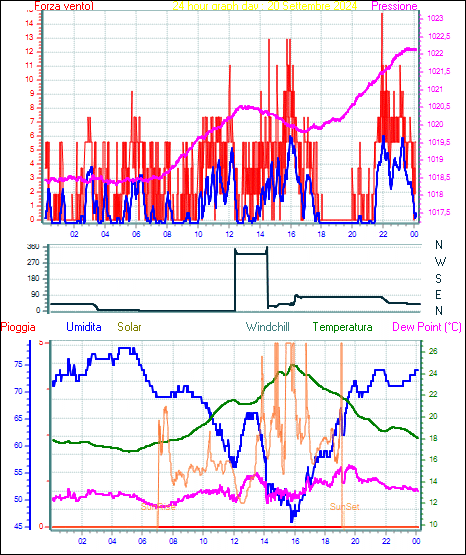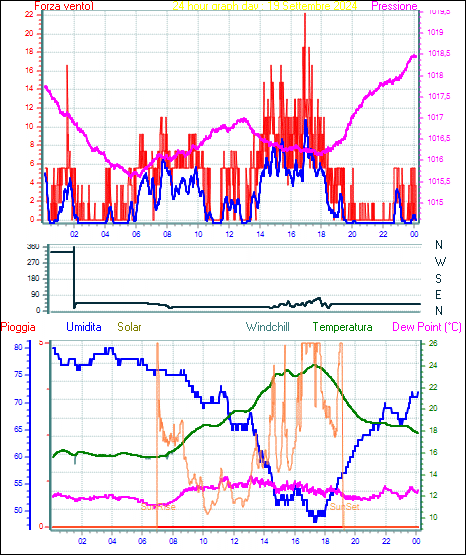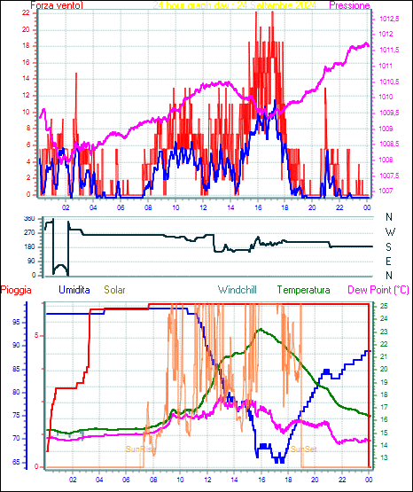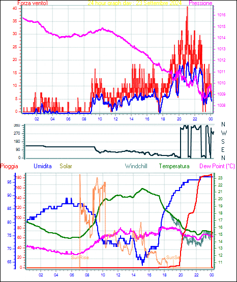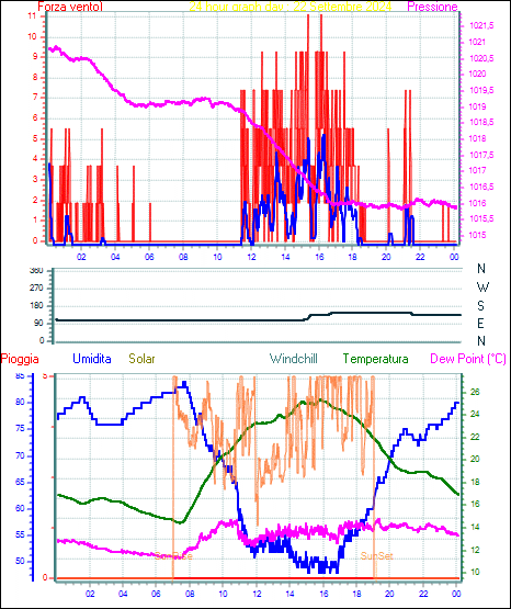 Il massimo windspeed = 22.2 kmh from 355°( N ) giorno 23 tempo 22:39